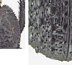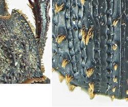 | 11 – Setole dei tubercoli elitrali posti sulle coste elitrali dispari lunghe quanto quelle poste alla base del pronoto. Coste pari nettamente pił strette delle dispari, quasi piatte |