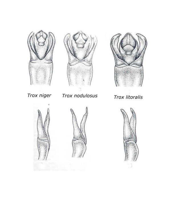Fino a non molto tempo fa le tre specie erano raggruppate sotto T. hispidus, è solo grazie al lavoro di Pittino (1991) che i caratteri differenziali sono stati resi evidenti. Oltre ai caratteri indicati nelle chiavi, è utile considerare l’edeago e in particolare la forma del lobo mediano. Si aggiunga che in Sardegna si trova solo Trox nodulosus, mentre le altre due specie hanno areale parzialmente sovrapposto (nell’Italia centro-meridionale). Trox litoralis a differenza di T. niger ha ali ridotte ed è inetta la volo. Approfondimenti: PITTINO, R. 1991. On some Palaearctic "taxa" allied to Trox hispidus (Pontoppidan), with a brachypterous new species from Italy, Malta, Crete and the Balkan Peninsula (Coleoptera Trogidae) (XXXIV contribution to the knowledge of Coleoptera Scarabaeoidea). Boll. Ass. romana Ent. Roma 45 (1-4): 57-87 |